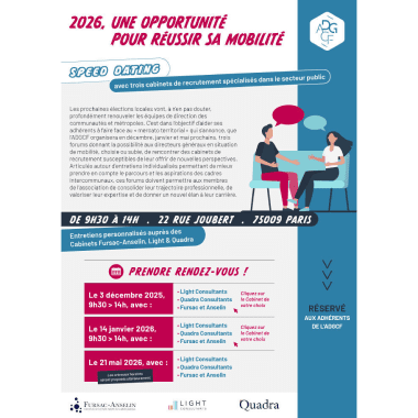 bifurcation » à la consolidation des dispositifs d'accompagnement et de solidarité que nous proposons à nos adhérents, en passant par le déploiement d'un cursus de formation destiné aux élus locaux porté par l'ADGCF et Sciences Po Paris, avec le soutien d'Intercommunalités de France. L'occasion, aussi, de proposer et de valider les nouveaux chantiers pour l'année à venir. On retiendra tout d'abord l'organisation d'un cycle de rencontres en région visant à promouvoir notre nouveau court-métrage, Les Faiseurs de bifurcation ; ensuite, dans la perspective des élections locales de 2026 et de son corollaire, le « mercato » territorial, la mise à l'agenda de forums de rencontres entre des cabinets de recrutement et nos adhérents en situation potentielle de mobilité ; l'attribution, enfin, au Conseil Scientifique de l'ADGCF d'une nouvelle mission, modéliser, à l'aune des grandes transitions, la nouvelle génération de projet de territoire et confectionner un guide méthodologique ad hoc. Je reviendrai dans une autre newsletter sur cette démarche qui renvoie à l'ADN même de l'intercommunalité.